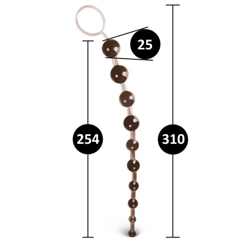 10 análních kuliček průměru 10 - 25 mm na šňůrce délky 31 cm, často označované jako thajský řetěz jsou z pružného, hladkého, středně tuhého TPE gelu černé barvy. Kuličky jsou uspořádány se stupňovitě se zvětšujícím průměrem a na konci jsou ukončeny praktickým gelovým kroužkem pro jednoduchou manipulaci.