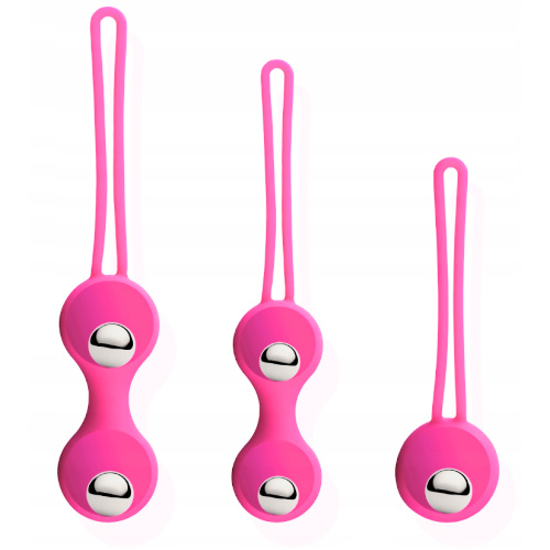 Kompletní sada Venušiných kuliček různých velikostí a hmotností, vyrobených z růžového 100% silikonu. Uvnitř každé z kuliček se nachází menší ocelová kulička způsobující při pohybu silné vibrace. Šňůrku tvoří smyčka pro snadné a bezpečné vytahování. Perfektní pro posílení pánevního dna, zejména u žen po porodu, či příjemnou stimulaci vagíny.