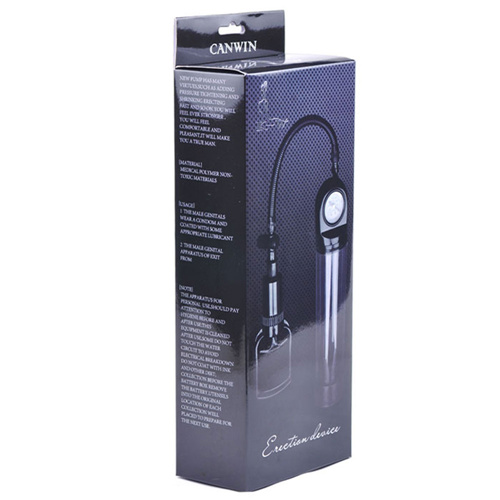 Silná vakuová pumpa s transparentním cylindrem a silikonovu těsnící manžetou univerzální velikosti, která se přizpůsobí přesně podle velikosti Vašeho penisu. Pumpa je vybavena manometrem, díky kterému uvidíte hodnotu podtlaku. Ohebná gumová hadička je zakončena odsávací pumpou a upouštěcím ventilem pro maximální bezpečnost. Výborný pomocník pro dosažení skvělé erekce. K lubrikaci používejte pouze lubrikanty založené na bázi vody. Propojovací hadičkou je připojen odsávací píst jehož stiskáním dochází ke snižování tlaku uvnitř válce. Válec se nasazuje na penis až k jeho kořeni s použitím kvalitního lubrikantu. Výrobci doporučují odstranění pubického ochlupení, ale u tohoto typu s těsnící manžetou to většinou není nutné. Při snížení atmosférického tlaku okolo penisu dojde automaticky k zvýšení krevního tlaku uvnitř penisu a tím i výraznějšího plnění topořivých tělísek.