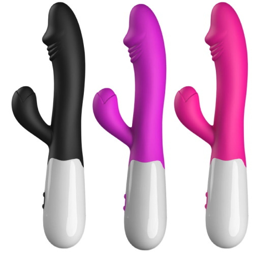 Voděodolný silikonový vibrátor s moderními designovými křivkami ve stylové černé barvě. Výhodou tohoto typu vibrátorů (rabbit) je, že disponují dvěma motory a umožnují vaginální i klitorální stimulaci zároveň. Je silný, svižný, má dlouhou výdrž, i když potřebuje jen 2 AAA baterie. Nabízí Vám neuvěřitelných 30 různých druhů vibrací, které můžete podle potřeby a nálady libovolně měnit. Jeho tělo je vyrobené z hebkého silikonu a ABS plastu, což jsou netoxické a pachů prosté materiály. Ovládací panel je vybaven tlačítkem pro zapínání a vypínání a tlačítkem pro výběr intenzity vibrací.