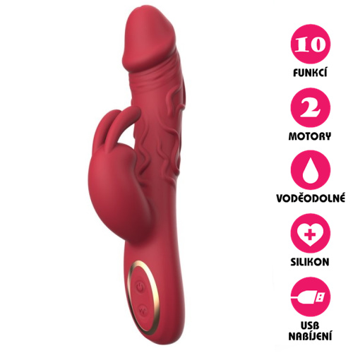 Voděodolný silikonový vibrátor s perfektním designem, vyrobený z červeného 100% silikonu a disponující 10 druhy vibrací a dvěma motory. Napájen je lithiovým akumulátorem, který je možno dobíjet přes USB kabel, který je součástí. Umožňuje vaginální (G bod) i klitorální stimulaci zároveň.