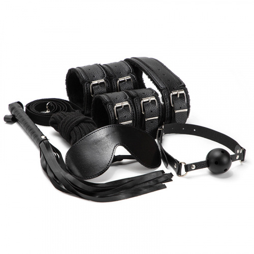 Sedmi dílná sada na bondage vyrobená z černé umělé kůže. Sada obsahuje: Pouta na ruce, Pouta na nohy, Masku přes oči, Roubík, Obojek, Bičík a Svazovací lano.