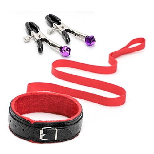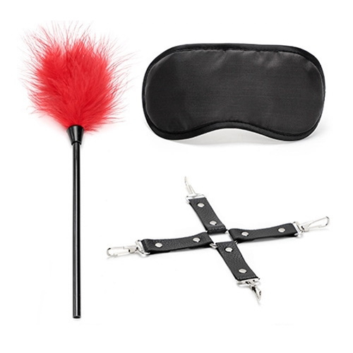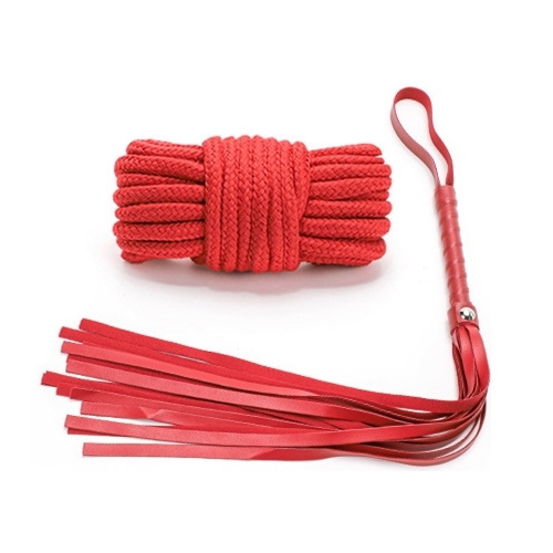 Deseti dílná sada na bondage vyrobená z příjemné, černé a červené umělé kůže. Sada obsahuje: Pouta na ruce, Pouta na nohy, Masku přes oči, Roubík, Obojek, Bičík, Svazovací lano, Lechtací pírko, Klipsy na bradavky, Kříž pro sepnutí pout na nohou a na rukou zároveň.